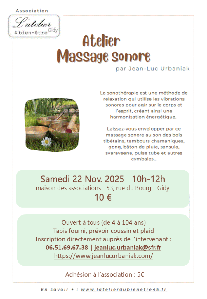 Prochain atelier => MASSAGE SONORE Samedi 22 Novembre 2025 10h-12h